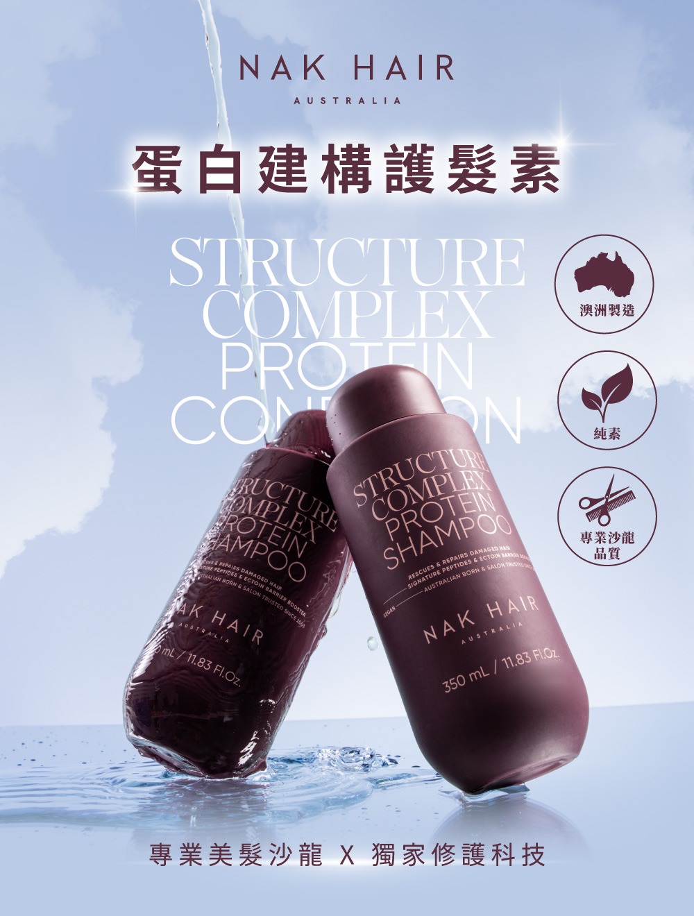 高濃度蛋白複合物深入毛鱗片,封存水分並修補受損空隙。
